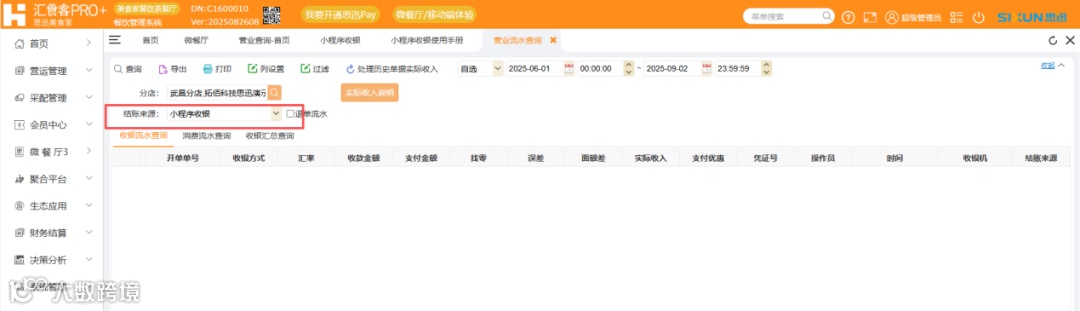 可在汇食客后 - 决策分析 - 营业查询 - 营业流水查询,通过筛选条件“结账来源” 选项中选择 “小程序收银”,即可查看对应的支付流水,获取详细的营业数据。