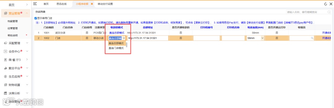 区分【直连总部模式】和【直连门店模式】2种模式,其中: