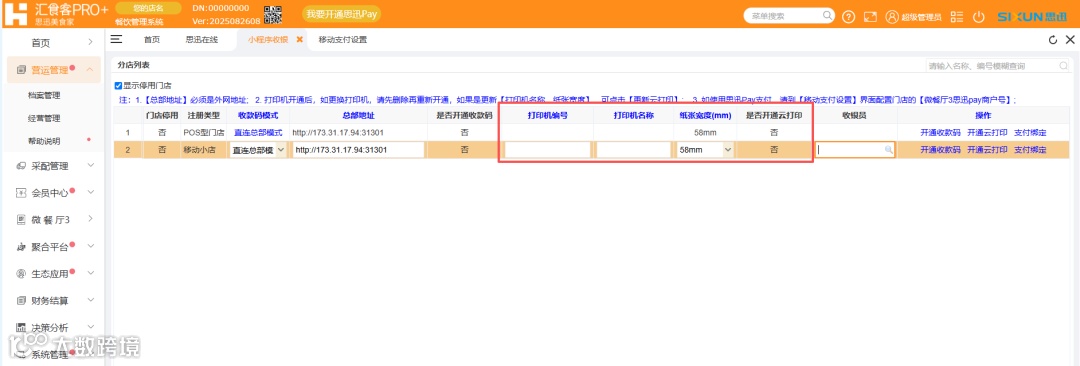 设置路径:汇食客后台- 生态应用 - 移动餐厅 - 小程序收银,可在此页面完成小程序收款码、云打印机、支付绑定等设置,如图:
