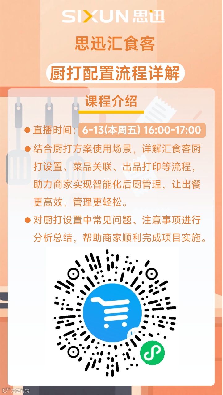 为了帮助大家在项目实施的时候少踩坑,本周五下午4点我们为大家带来【思迅汇食客厨打配置详解】课程,为大家全面梳理厨打配置流程和常见问题解析!欢迎大家来【思迅微课堂】直播间准时听课哟!!