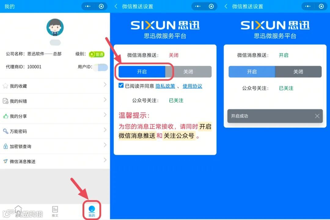 在思迅微服务小程序【我的】-【微信消息推送设置】中开启“微信消息推送”。