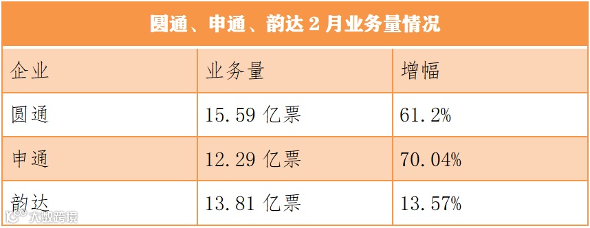 3月17日,圆通、申通、韵达发布2月份业绩简报,三家企业均保持良好增长态势。