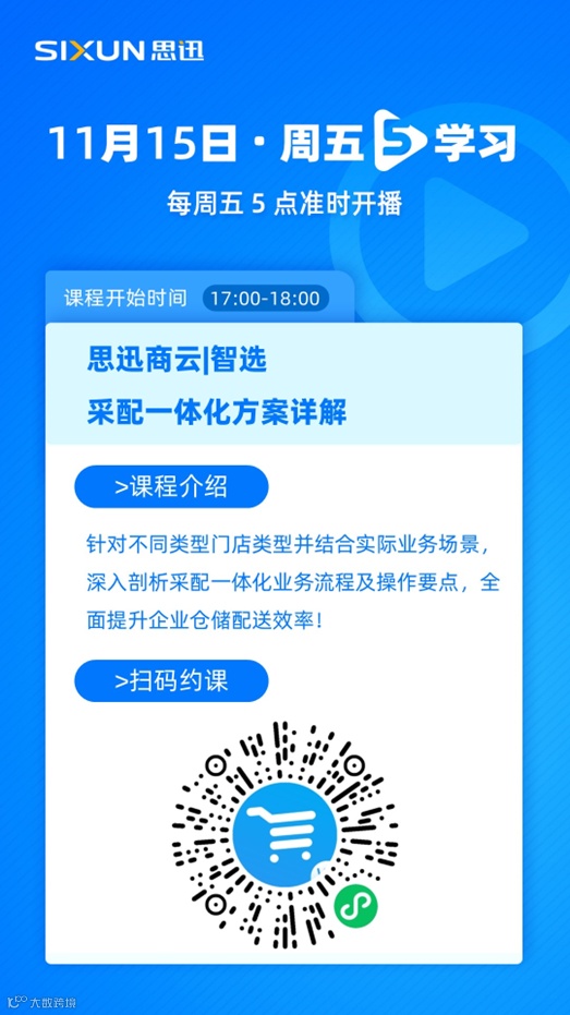 本周五下午5点 我们为大家带来商云|智选采配一体化方案的优势及亮点功能介绍!同时帮助大家梳理总部与各门店间的采配流程及常见问题解析,让大家轻松掌握采配异常情况的处理方法!感兴趣的伙伴千万别错过!欢迎大家来【思迅微课堂】直播间准时听课哟!