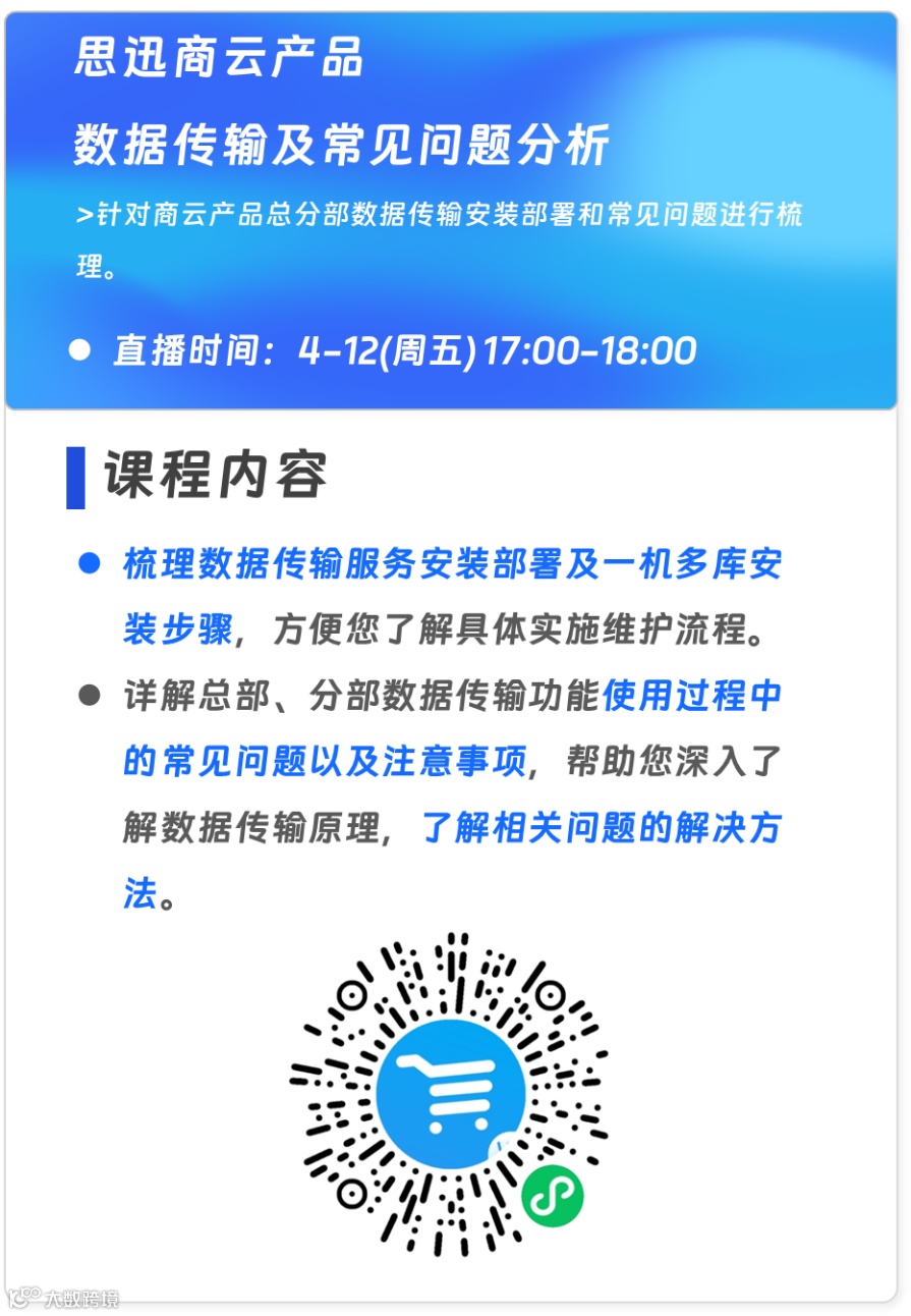 本期思迅微课堂直播课将为大家带来商云产品数据传输服务配置和常见问题等相关的内容讲解,欢迎大家来思迅微课堂直播间准时听课哟!