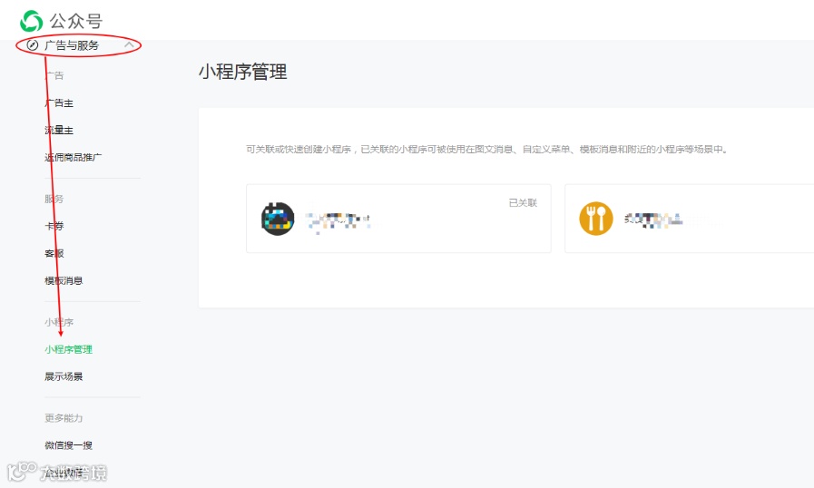 点击“广告与服务”→“小程序管理”,在小程序管理中点击“添加”按钮,进行“公众号与思迅美食家餐饮小程序关联”。