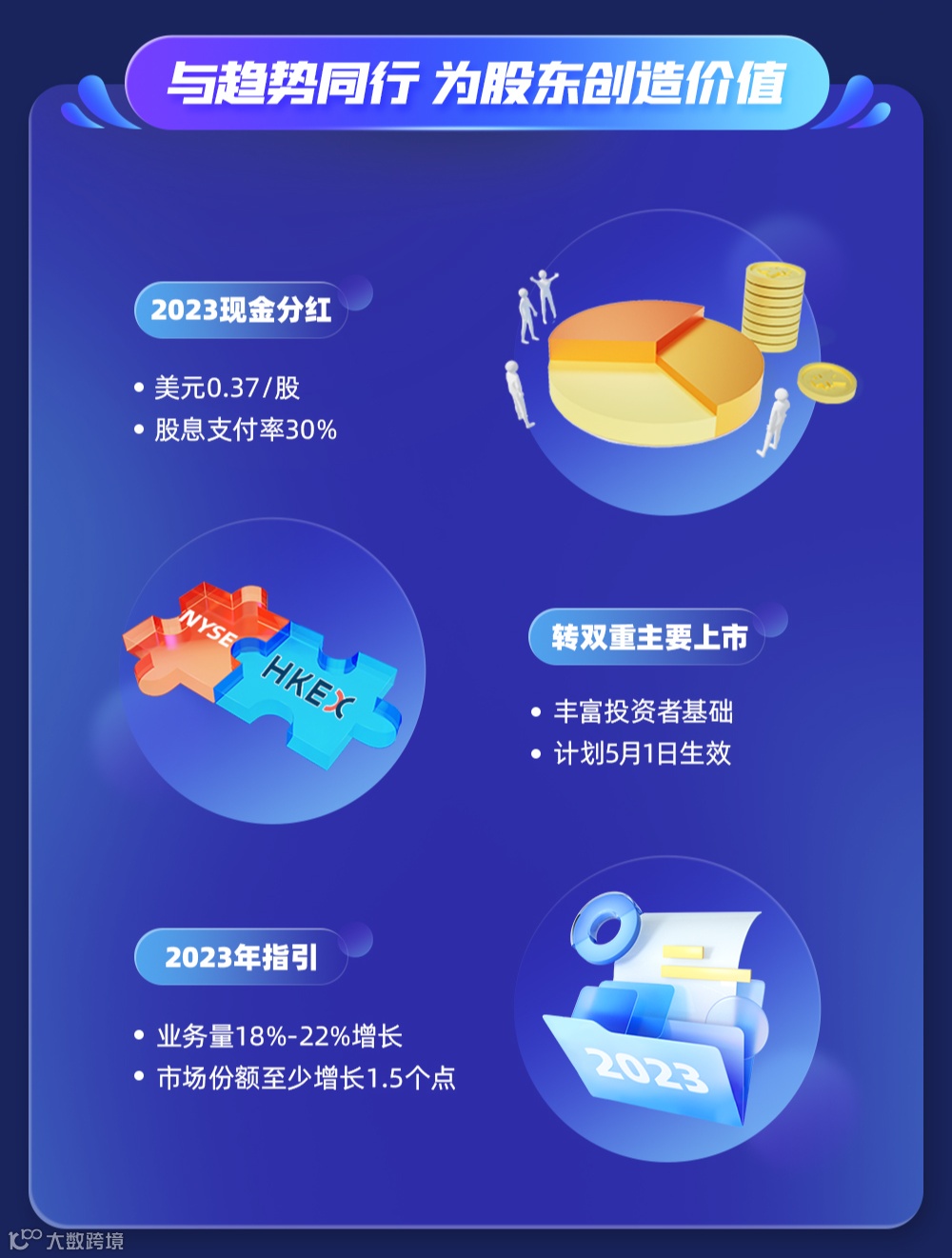 基于当前市场条件和运营情况,公司预计2023年的全年包裹量将在287.8亿-297.5亿件的区间,同比增长18%-22%。基于整体市场表现判断,公司有信心实现全年市场份额至少增长1.5个百分点的目标。同时,公司董事会已批准2022年每股美国存托股及每股普通股0.37美元的特别股息,派发予于2023年4月6日营业时间结束前名列登记册的股东。