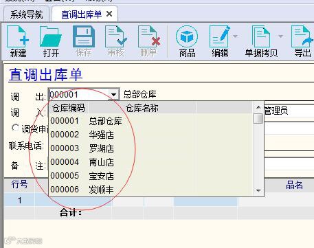 调拨出库单:总部 — 直调出库单— 可以选择对应的门店进行调出业务。