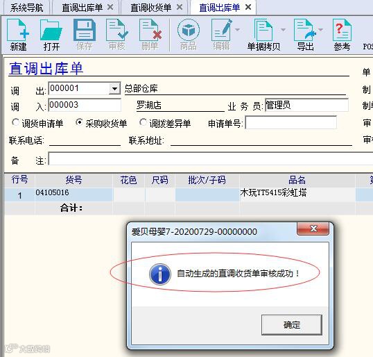 总部直接做调拨出库单,审核之后则无需收货门店进行收货。单据提示审核成功后,会继续提示‘自动生成的直调收货单审核成功’,这样收货门店库存就直接增加,无需再次操作。