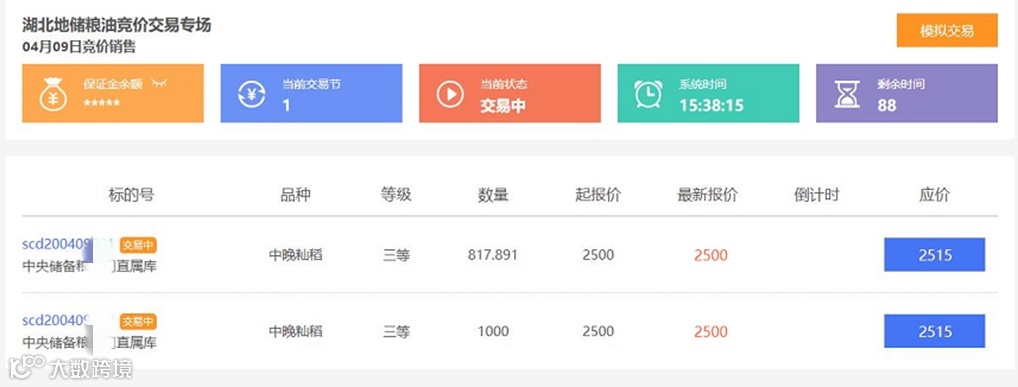 2020年4月9日,中华粮网承建的国粮中心新版地储SaaS交易平台正式上线运行,并成功举办“湖北地储粮油定向交易专场” 交易会。此次交易共投放湖北省地方储备粮1.5万吨,经过充分竞价,成交1.5万吨。