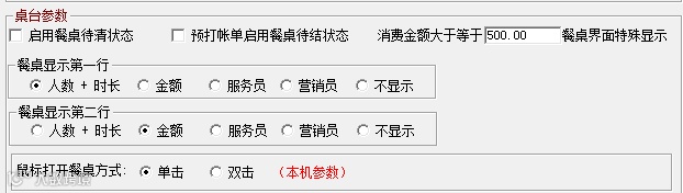 根据需要勾选“启用餐桌待清状态”、“预打账单启用餐桌待结状态”、“消费金额大于XX餐桌界面特殊显示”。