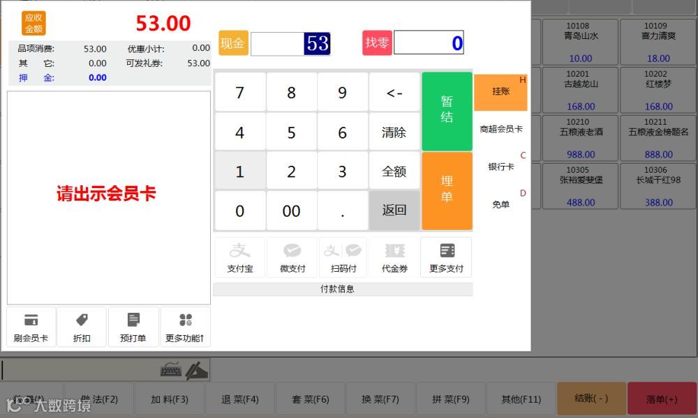 结账时可通过快捷键实现快速结账的目的(后台基础资料-收银方式中设置各收银方式的快捷键)。