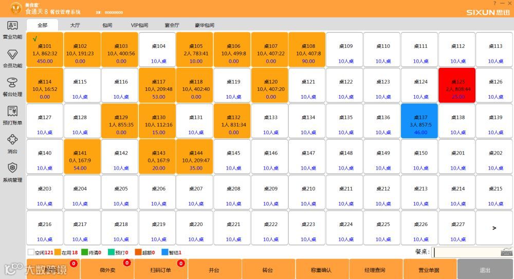当设置此类参数后,在前台可很清晰的看到各餐桌的状态,如结账后可通过待清参数知道那些餐桌需要服务员去清理并及时通知。
