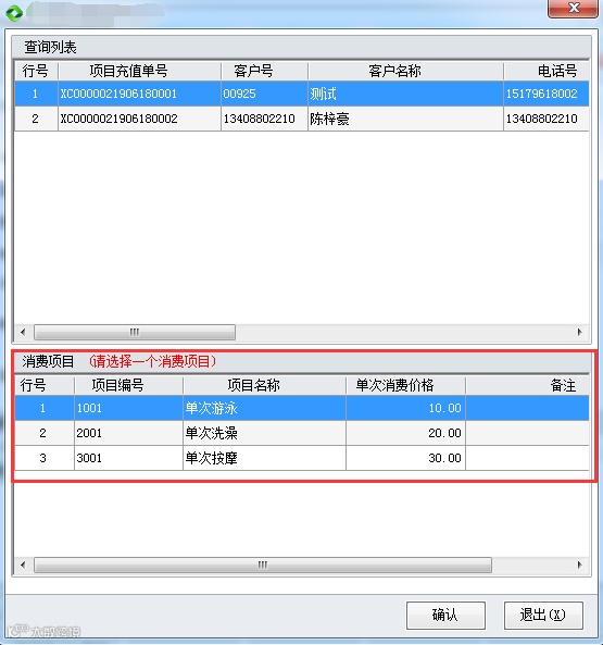 消费金额也是先查询出对应的计次单号,不同的是,进行金额消费需要先选择消费的项目,再做对应项目的金额扣减,具体情况如下图所示: