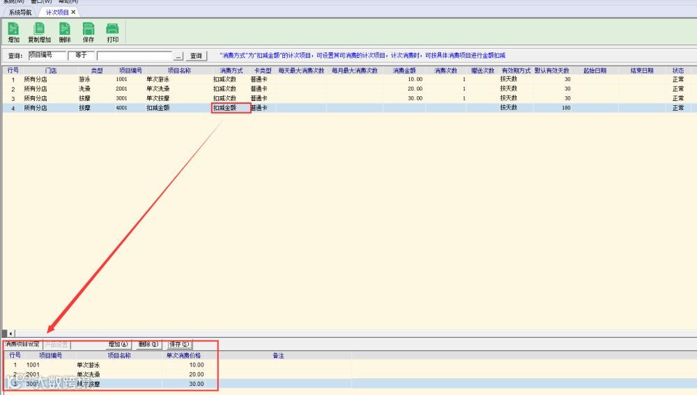 扣减次数:充值项目次数,消费时扣减相应项目次数。