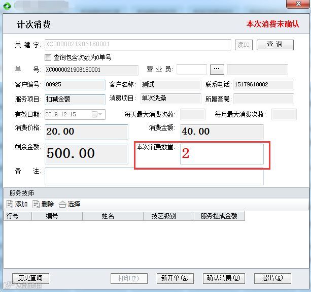 2. 输入本次消费次数,选择对应的营业员点击确认消费即可。(选择营业员是为了便于计算提成)