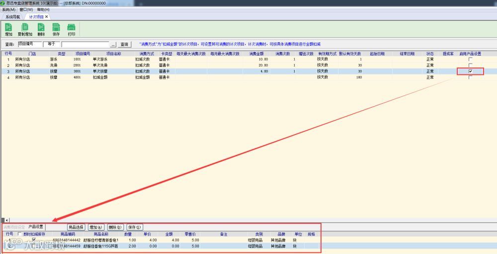 3.启用产品设置是指客户购买的计次项目需要使用一些单独的产品才能完成,例如按摩,可能就需要购买精油等美容产品等。