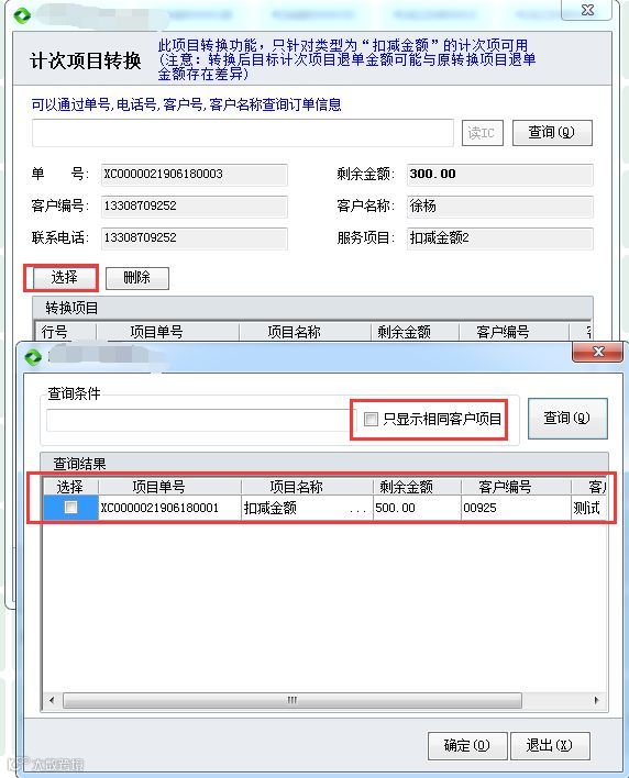 勾选只显示相同客户项目,查询出来的项目就只是自身的,不勾选就默认显示出所有充值过消费金额的计次项目。