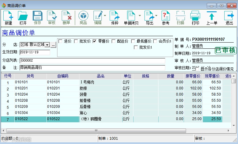 点击“下一步”完成后,会生成一张商品调价单,在商品调价单中保存审核后生效。