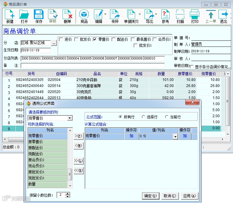可按分店和日期设定价格调整范围和生效时间,通过商品选项按类别、品牌、供应商快速获取商品调价明细,使用编辑中的通用公式设定条件,实现价格的快速调整。