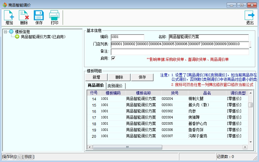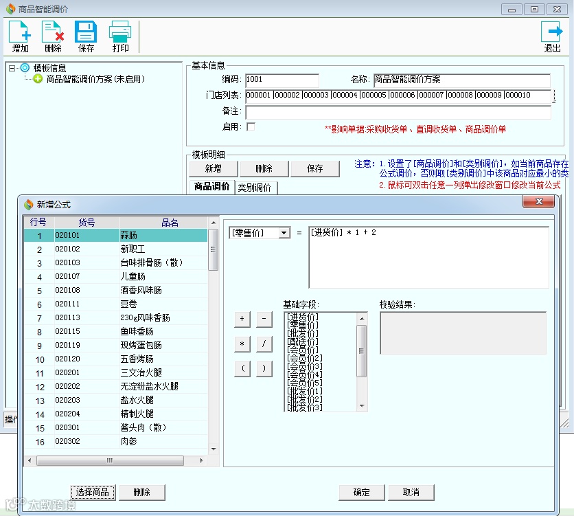 使用智能调价需先设定条件模板,在新增选项中可按商品和类别设定调价公式。勾选影响单据采购收货单、直调收货单、商品调价单的启用选项。