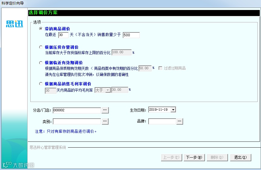 可按滞销商品调价、根据压货存量调价、根据临近有效期调价、根据商品销售毛利率调价四种调价方式,通过条件获取需要调价的商品信息。