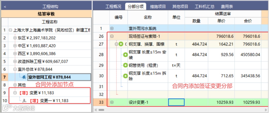 合同内或合同外新增的工程内容,均可在软件中进行增补录入操作。增补后软件将通过差异化颜色及专属图标进行醒目标识。