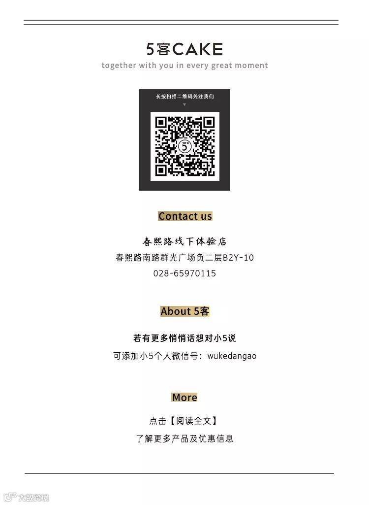 5客CAKE,甜得刚刚好。欧盟级供应链严控食材。订购专线:4006-234-005,提前5小时订购,成都绕城及五郊县城区(新都、温江、郫县、双流、龙泉)免费配送,服务时间:08:30-22:00 送货时间:11:00-21:30。