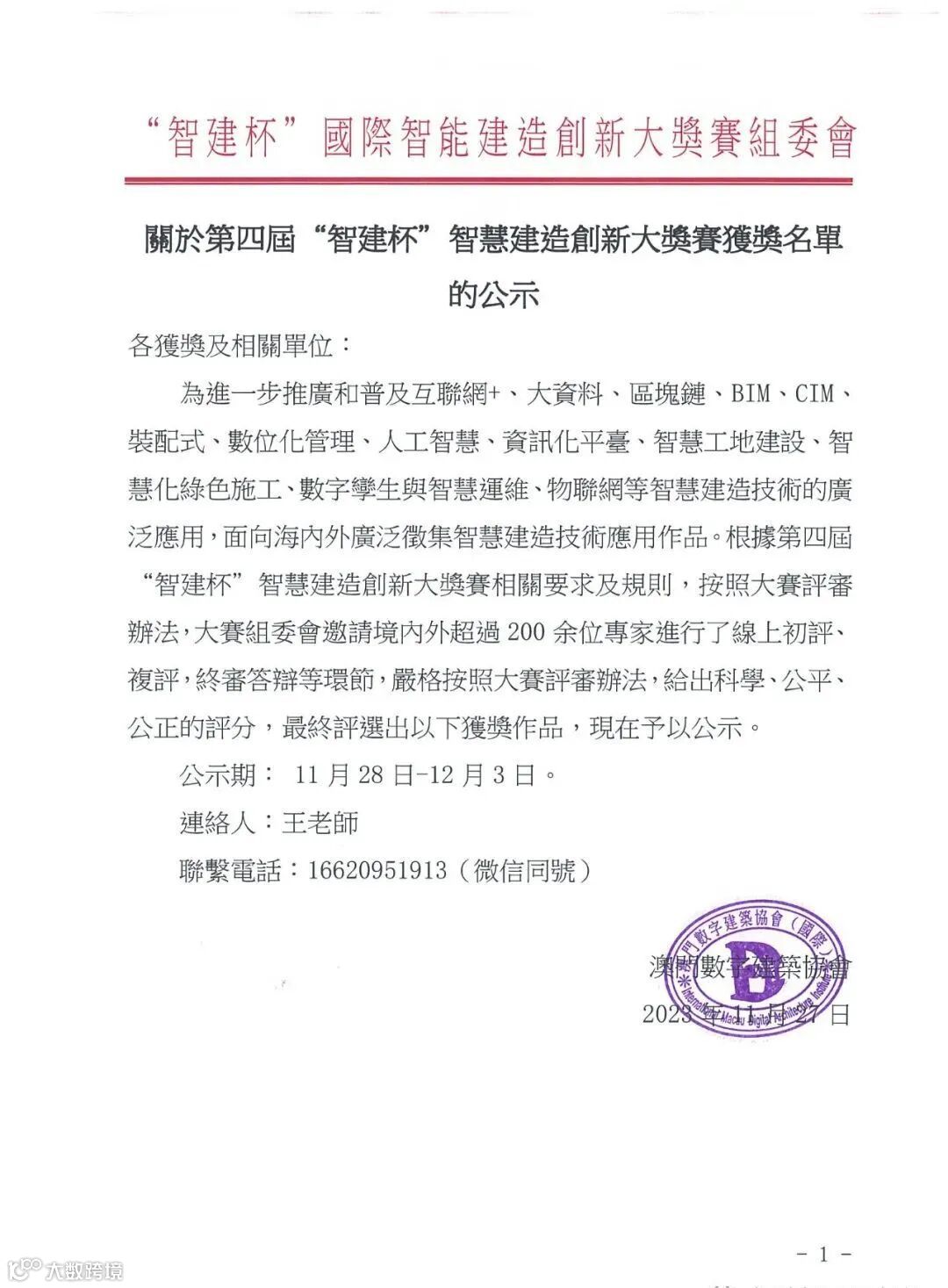 “智建杯”智慧建造创新大奖赛是由澳门数字建筑协会、澳门建筑资讯模型协会、香港建筑信息模拟学会、粤港澳大湾区城市建筑学会(香港)主办。旨在推广和普及互联网+、大数据、区块链、BIM、CIM等智慧建造技术的广泛应用。