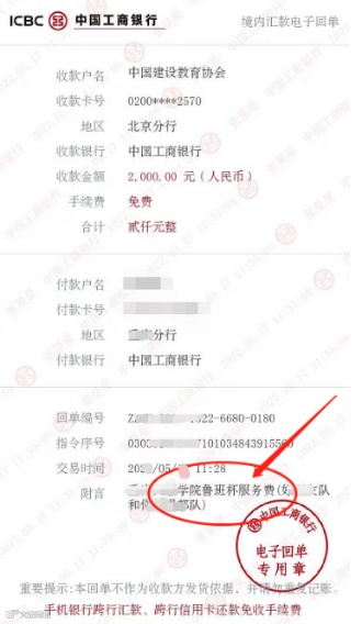 2023年5月13日前将决赛服务费(1000元/支队伍)汇款至中国建设教育协会,汇款时务必注明“***院校鲁班杯服务费”,便于核实缴费情况。