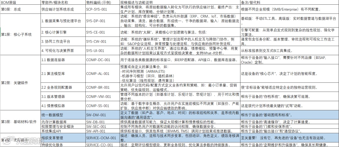 通过这个"BOM“视角,我们可以清晰地看到一台现代化的供应链计划”设备“不再是单一的软件,而是一个由技术、流程、数据和人高度融合的复杂系统,或许正是因为企业无法单个拥有整个BOM视角,软件公司亦然,企业做不好计划纯属不是偶然。