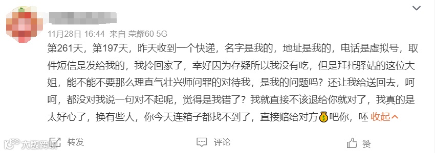 而消费者因为虚拟号码导致的快递取错、丢失等等情况,最终的责任承担者,往往还是落在驿站和快递员身上。