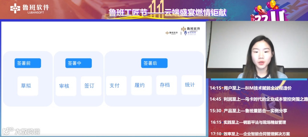 鲁班商务产品经理江嘉琳为用户带来了《效率至上—企业智能合同管理解决方案》,帮助企业智能化合同管理,提升合同管理效率。