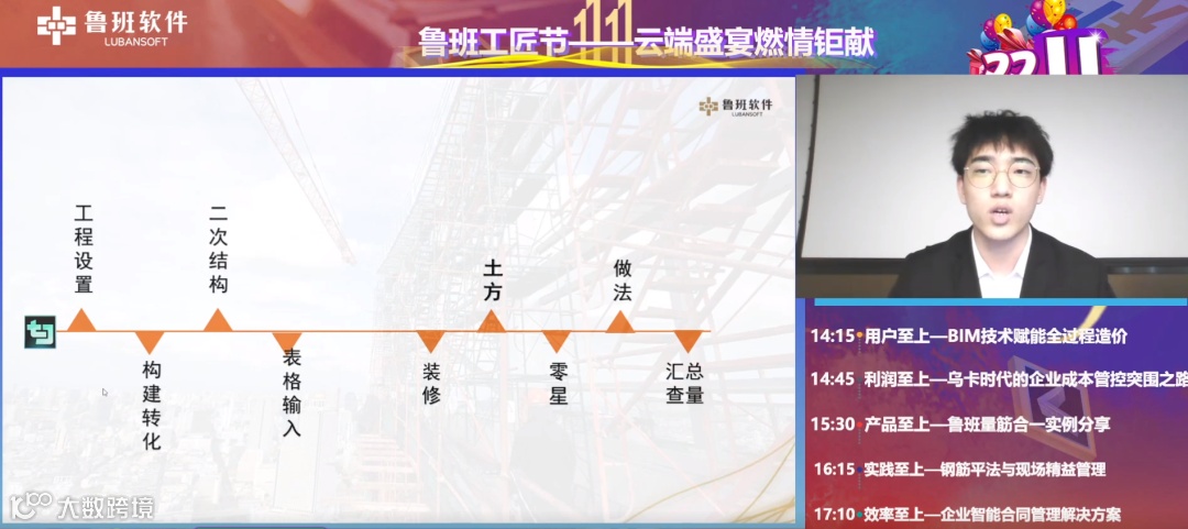 2022年11月11日,鲁班工匠节—双十一云端盛宴在线上成功举办。中建八局上海分公司钢筋精益管理工程师向云国及鲁班软件多位产品经理为用户带来了精彩分享,活动吸引了近万人关注,现场互动热烈,干货满满。