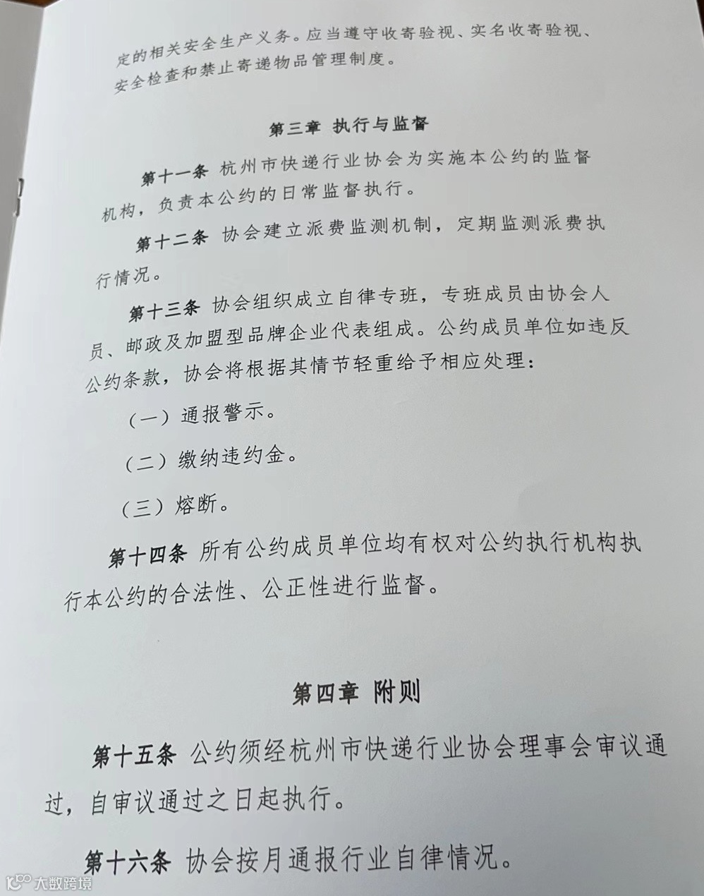 为了避免公约成为一纸空文,公约第十三条明确指出杭州市快递行业协会组织将成立自律专班,专班成员由协会人员、邮政及加盟型品牌企业代表组成。公约成员单位如违反公约条款,协会将根据其情节轻重给予相应处理。主要的处理方式有三:(一)通报警示、(二)缴纳违约金、(三)熔断。