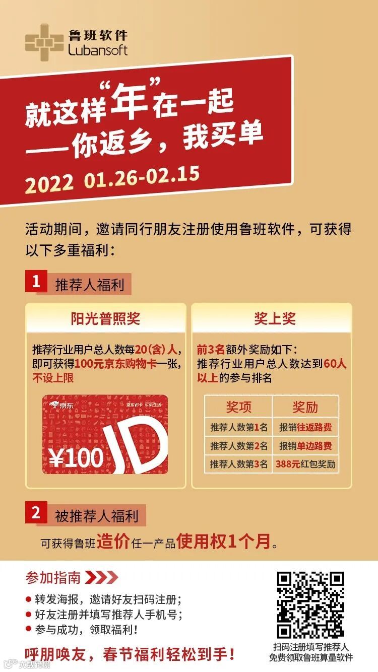 在新年即将来临之际,鲁班软件为广大用户带来了“你返乡,我买单”活动,呼朋唤友,一起来领取新春福利吧!