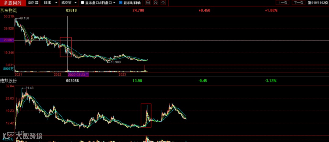 同样的收购结果,也发生在了京东和德邦这两家上市公司身上。2022年2月底京东物流宣布全资收购德邦,之后京东物流股价狂泻不已,可德邦反而向上,德邦的暴涨曾给京东物流账面带来接近百亿的投资浮盈,但终归都是纸上财富,在业绩披露连续不及预期情况下,德邦股价跌回原点。