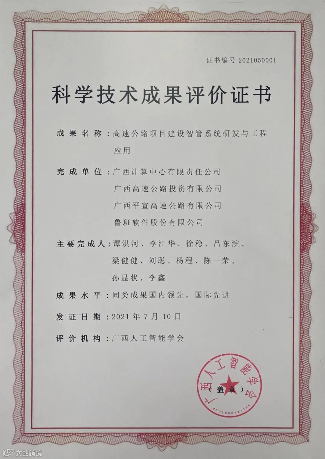 2021年7月10日,鲁班软件联合广西计算中心等单位申报的“高速公路项目建管系统研发与工程应用”获得人工智能学会授予的《科学技术成果评价证书》,成果位于同类成果国内领先,国际先进水平!