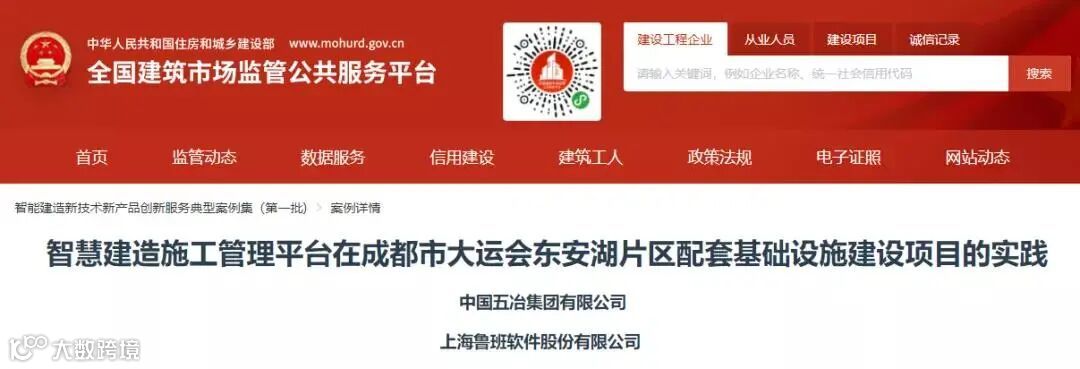 2021年12月15日,住房和城乡建设部发布了《住房和城乡建设部办公厅关于发布智能建造新技术新产品创新服务典型案例(第一批)的通知》。由中国五冶集团有限公司和鲁班软件股份有限公司联合申报的“智慧建造施工管理平台在成都市大运会东安湖片区配套基础设施建设项目的实践”实力入选住建部智能建造新技术新产品创新服务典型案例(第一批)!