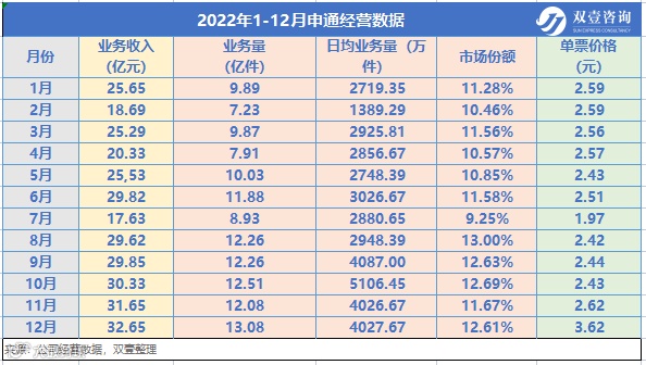 纵观申通在2022年各月的表现,全年月均业务收入为26.5亿元,月均业务量10.6亿件,全网日均业务量最高峰值为5106万件,市场份额全年维持在11.5%,这一成绩,对于申通快递而言实属不易。