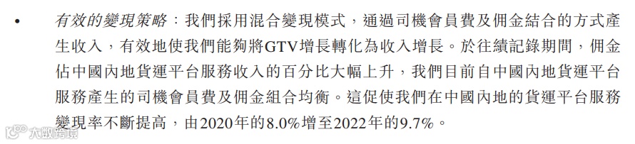 据介绍,货拉拉采用混合变现模式,通过司机会员费及佣金结合的方式产生收入,有效地将GTV增长转化为收入增长。
