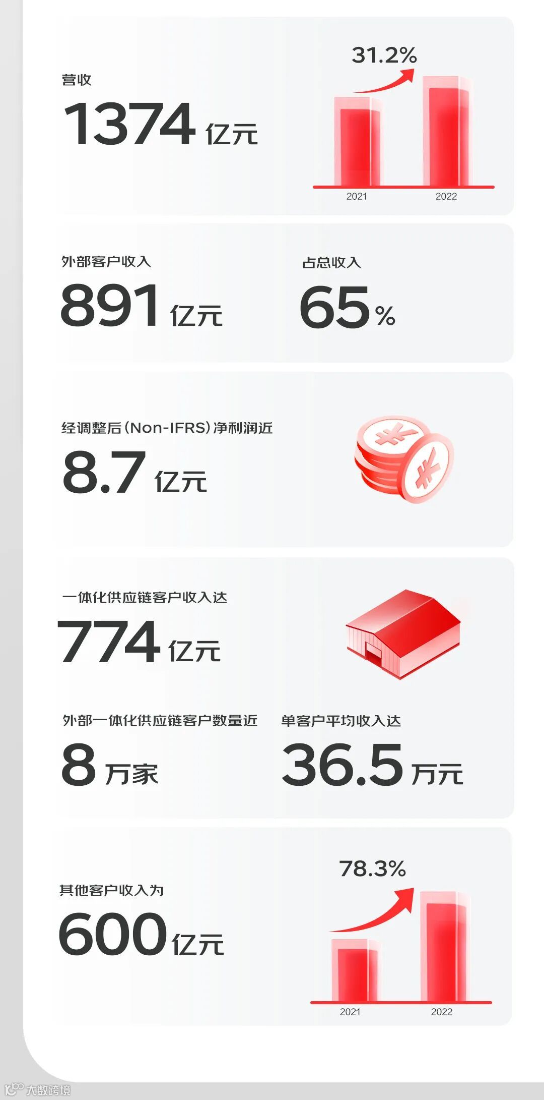 3月9日消息,京东物流股份有限公司(股票简称“京东物流”)今日发布2022年度业绩报告。报告显示,2022年,京东物流营收达1374亿元,同比增长31.2%,其中外部客户收入达891亿元,同比增长50.8%,占总收入的65%。