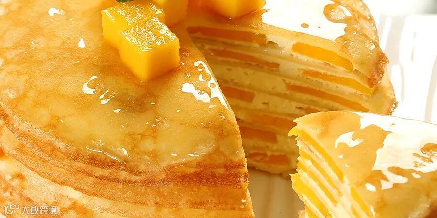 一层可丽饼皮,一层新鲜的芒果果粒,再涂抹上满满的新西兰动物淡奶油,再覆盖上一层可丽饼皮,如此反反复复,最后顶部再堆砌上几颗装饰芒果粒。