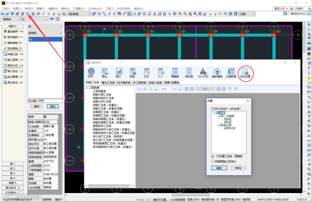 点击计算报表图标,进入到计算报表的界面,点击“分区设置”按钮,勾选“按分区统计(BIM应用)”复选框,点击“确定”按钮,那么查看的报表中,都会根据分区的要求将工程量分区显示出来,如下图所示: