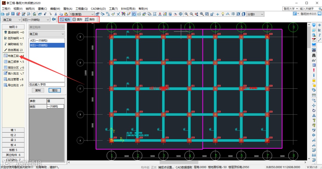 如果在施工过程中,如果个别构件所在位置为A区范围,但想要更改所属分区为B区先施工的话,那么可通过“轴网”-“指定分区”命令,进行分区归属的调整。如下图所示: