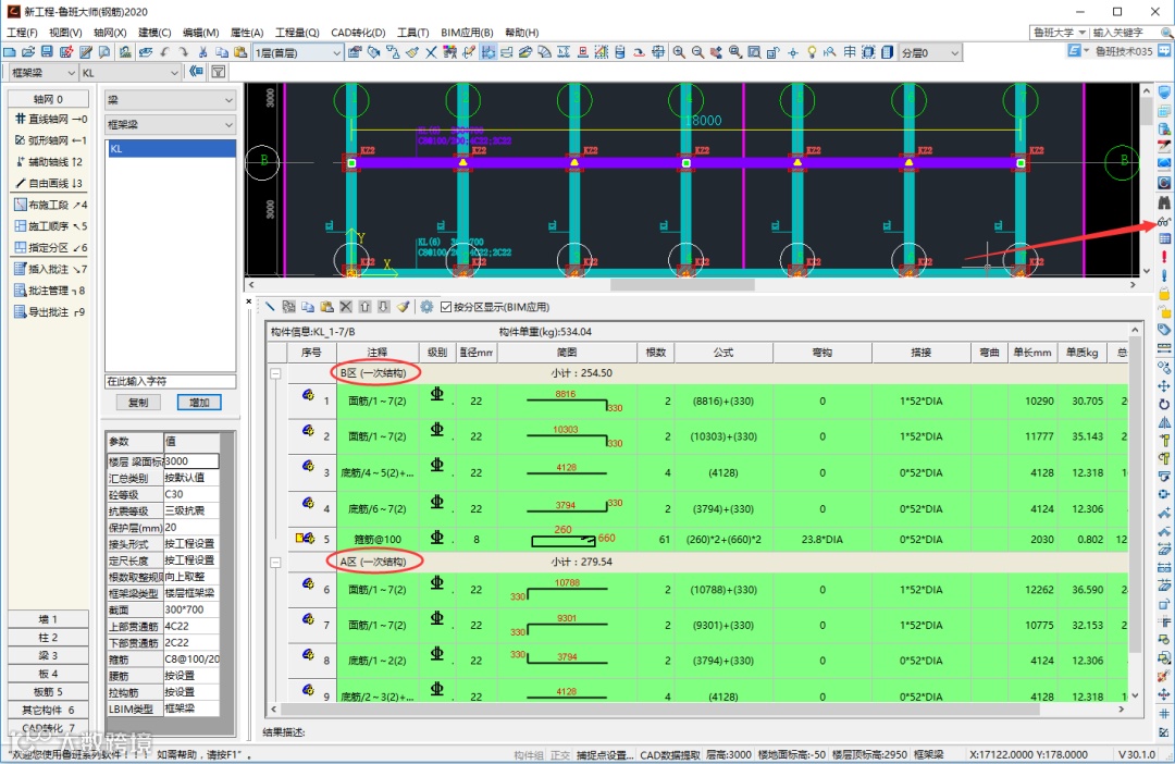 构件按施工段计算完成之后,会有一个按施工段分区的计算结果显示,点击查看单构件钢筋量,以查看梁构件的工程量为例,可看出选中的框架梁就会按A区和B区分别显示工程量,如下图所示: