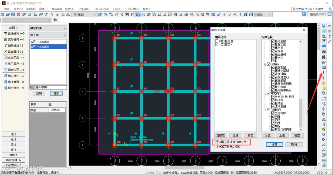 施工顺序设置完成之后,就可以进行计算了,点击工程量计算图标“!”,然后勾选“按施工段计算(BIM应用)”复选框,点击计算,如下图所示: