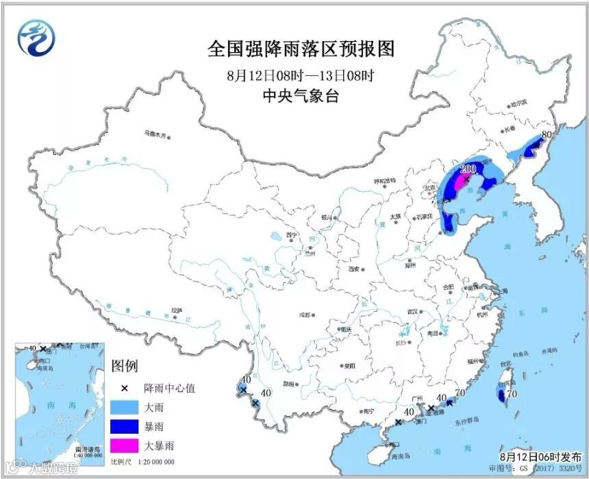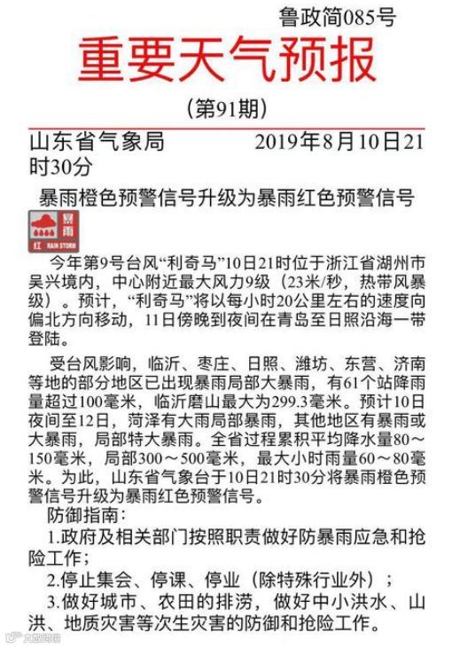 受“利奇马”和冷空气共同影响,未来三天,黄淮中东部、华北东部、东北地区大部等地有大到暴雨,部分地区大暴雨,局地特大暴雨。11日,山东、河北东部、天津东部、辽宁中南部、吉林东南部等地有暴雨,其中,山东中部和半岛东部、辽宁南部等地的部分地区有大暴雨(100~230毫米);12日,辽宁西南部、河北东北部有暴雨,局地大暴雨;13日,吉林西部、辽宁西部、内蒙古东部偏南地区、河北东北部等地的部分地区有暴雨,局地大暴雨。