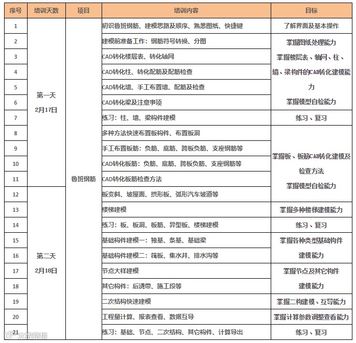 掌握基本思路、概念;掌握鲁班大师(钢筋)的基本操作,并掌握课程案例中工程实例的建模,在今后的工作中能灵活应用。