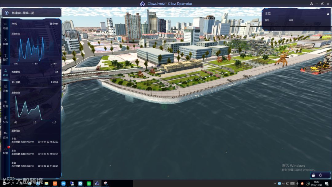 杨浦区15.5公里长水位进行监控,通过沿江区域布设水位监测点,CIM平台进行数据提取与展现,并通过强大的数据承载能力扩展原有数据更多的展示效果。包括当前水位高度,历史水位,当前报警信息,累积报警条数,历史报警记录,报警列表。当达到水位报警点时及时报警。