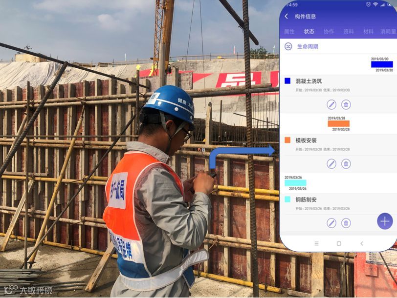 现在跟着监理和工程处小章前往5#泄水闸底板第一层,进行钢筋绑扎验收,在检查完成后,施工单位小邳利用“我的鲁班”APP在模型中搜索相应的构件,并填上实际的完成时间,同时填上了模板搭设的开始时间,在确认施工单位填完后,工程处小章在验收单上签字确认。“现在不在这东西(我的鲁班)上把相应进度填上去,验收就通过不了,就不能进行下一道工序,晚上我还得把相应资料(质检资料、施工照片、责任人等)挂到BIM构件上”,小邳笑着说。